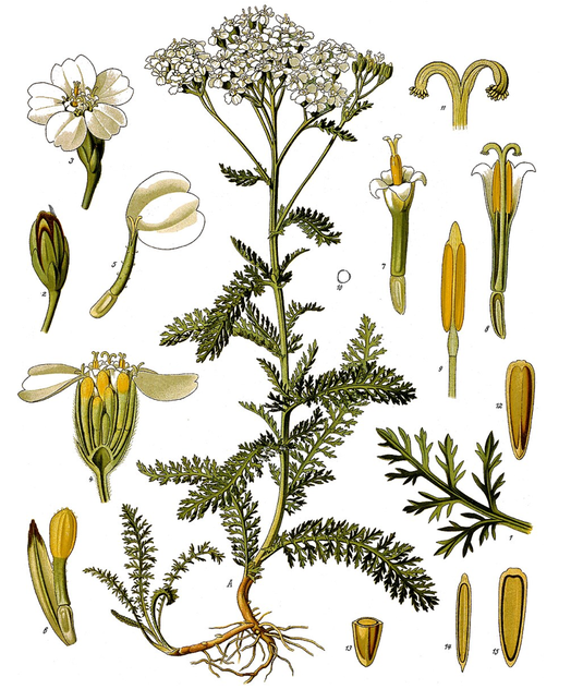 L'achillée millefeuille est une plante vivace herbacée mesurant de 30 à 60 cm, reconnaissable à ses feuilles très découpées (d'où son nom "millefeuille") et ses fleurs blanches ou rosées regroupées en corymbes* denses. Originaire d'Europe et d'Asie tempérée, elle pousse désormais sur presque tous les continents, s'adaptant à de nombreux types de sols et d'environnements.